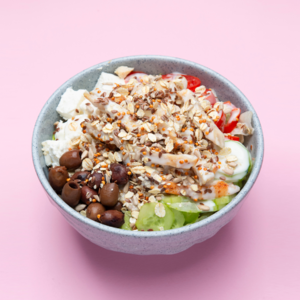 Insalata / Feta / Pollo / Pomodorini / Cetrioli / Olive / Salsa yogurt / Mix di semi