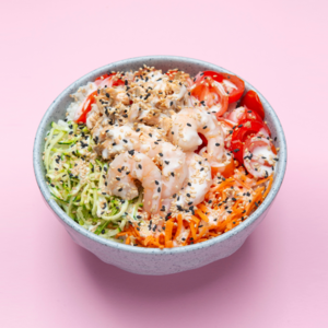 Base a scelta / Mazzancolle / Salmone cotto / Carote alla julienne / Zucchine alla julienne / Pomodorini / Salsa yogurt / sesamo